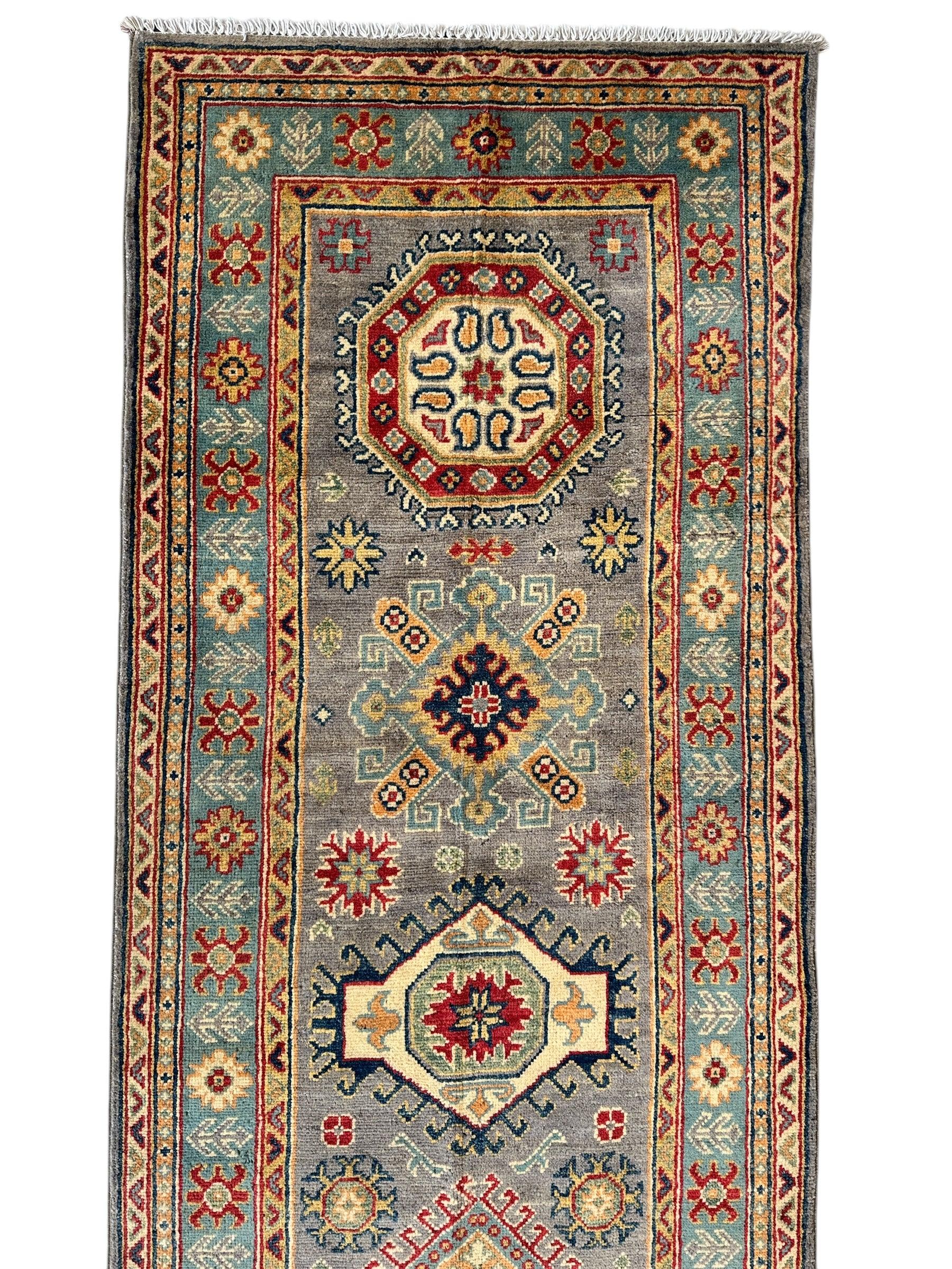 Hand-Knotted Afghan Kazak Wool Runner Rug – 2'7" x 12'3" – Traditional Geometric Design
