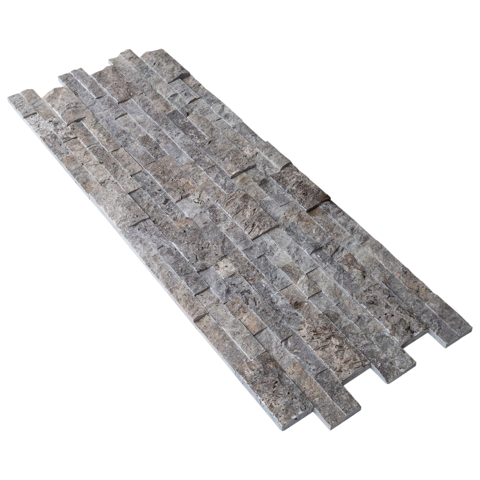 Silver Ledger 3D Panel 6"x24" Natural Travertine Wall Tile - Full Truckload offers dark and light gray colors with hints of beige for unstoppable design versatility. Featuring multiple sized rectangular stones in varying thicknesses, this panel adds interest and dimension to any space.